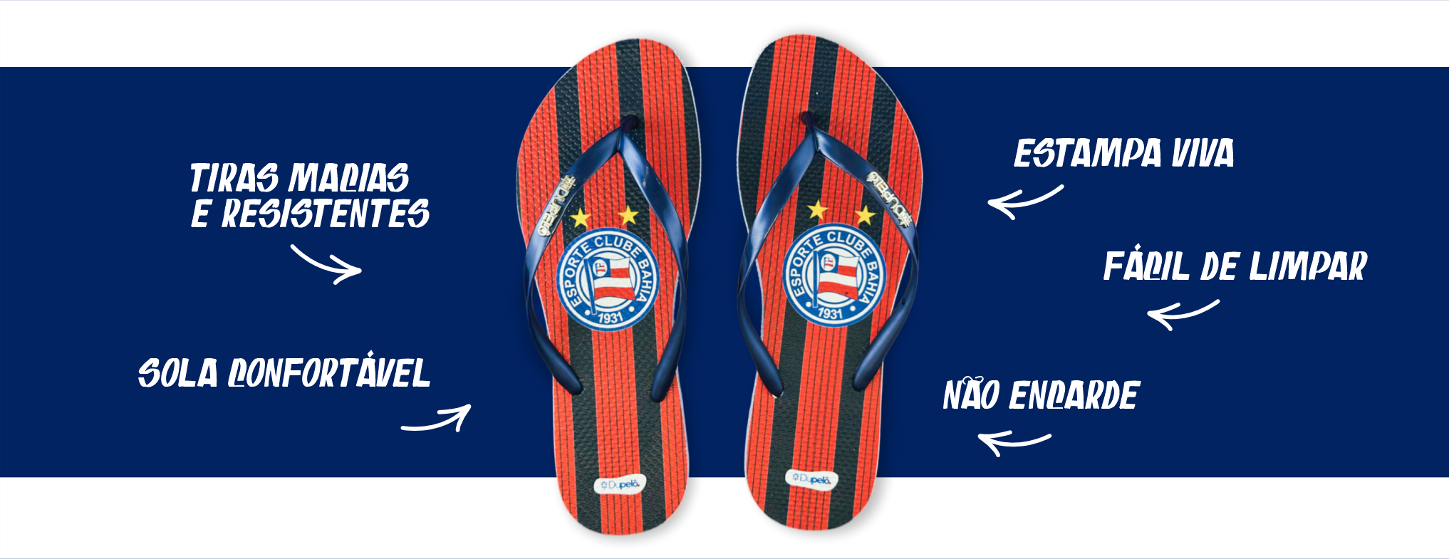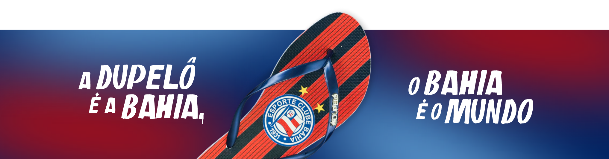 Este modelo destaca-se pelo seu visual clássico e vibrante, apresentando listras verticais em azul e vermelho que celebram as cores tradicionais do clube. O escudo oficial do Esporte Clube Bahia é posicionado com destaque na palmilha, garantindo a autenticidade do produto. O diferencial deste SKU são as tiras slim em tom azul marinho metálico, que oferecem um calce mais leve e elegante, complementadas pelo detalhe do logo Dupelô em dourado, agregando um toque de sofisticação.