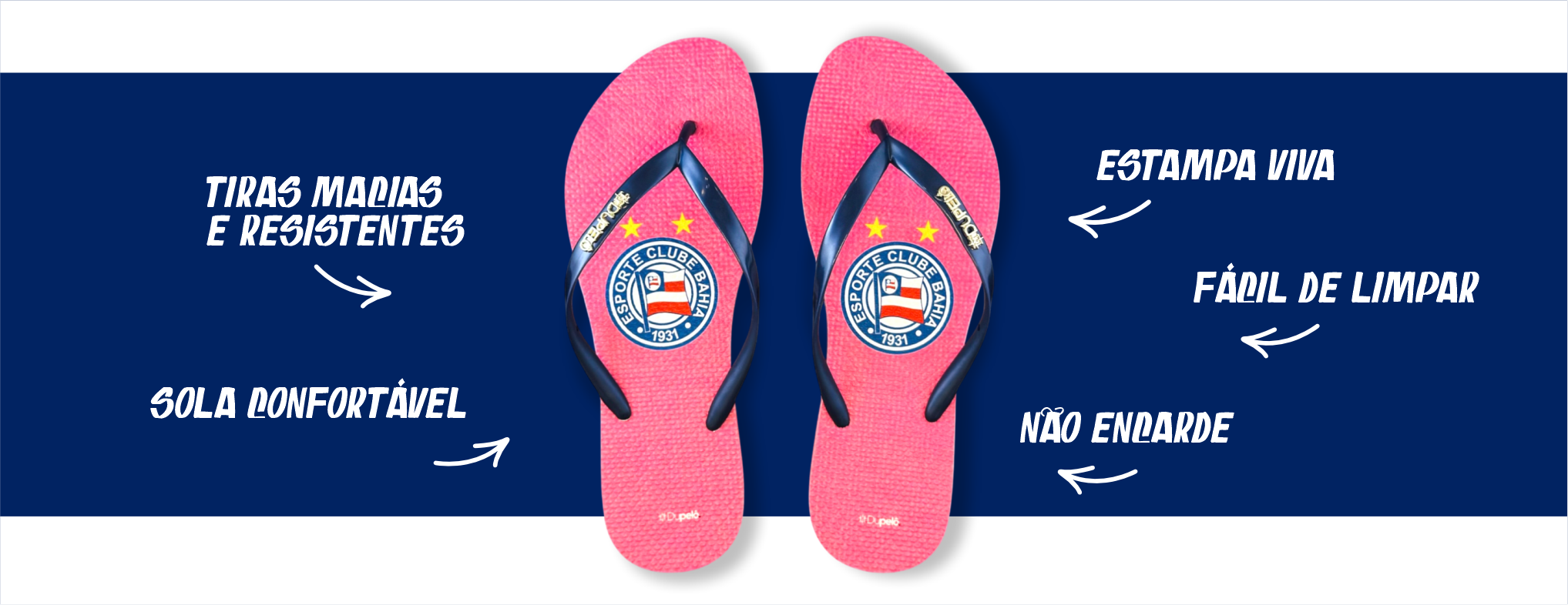 Este modelo exclusivo destaca-se pela sua tonalidade rosa vibrante em toda a palmilha, criando um contraste moderno e arrojado com o escudo oficial do Esporte Clube Bahia posicionado ao centro. O diferencial deste SKU são as tiras slim em tom azul marinho metálico, que oferecem um calce mais leve e elegante, complementadas pelo detalhe do pin metálico dourado com a marca Dupelô, agregando um toque de sofisticação e exclusividade.