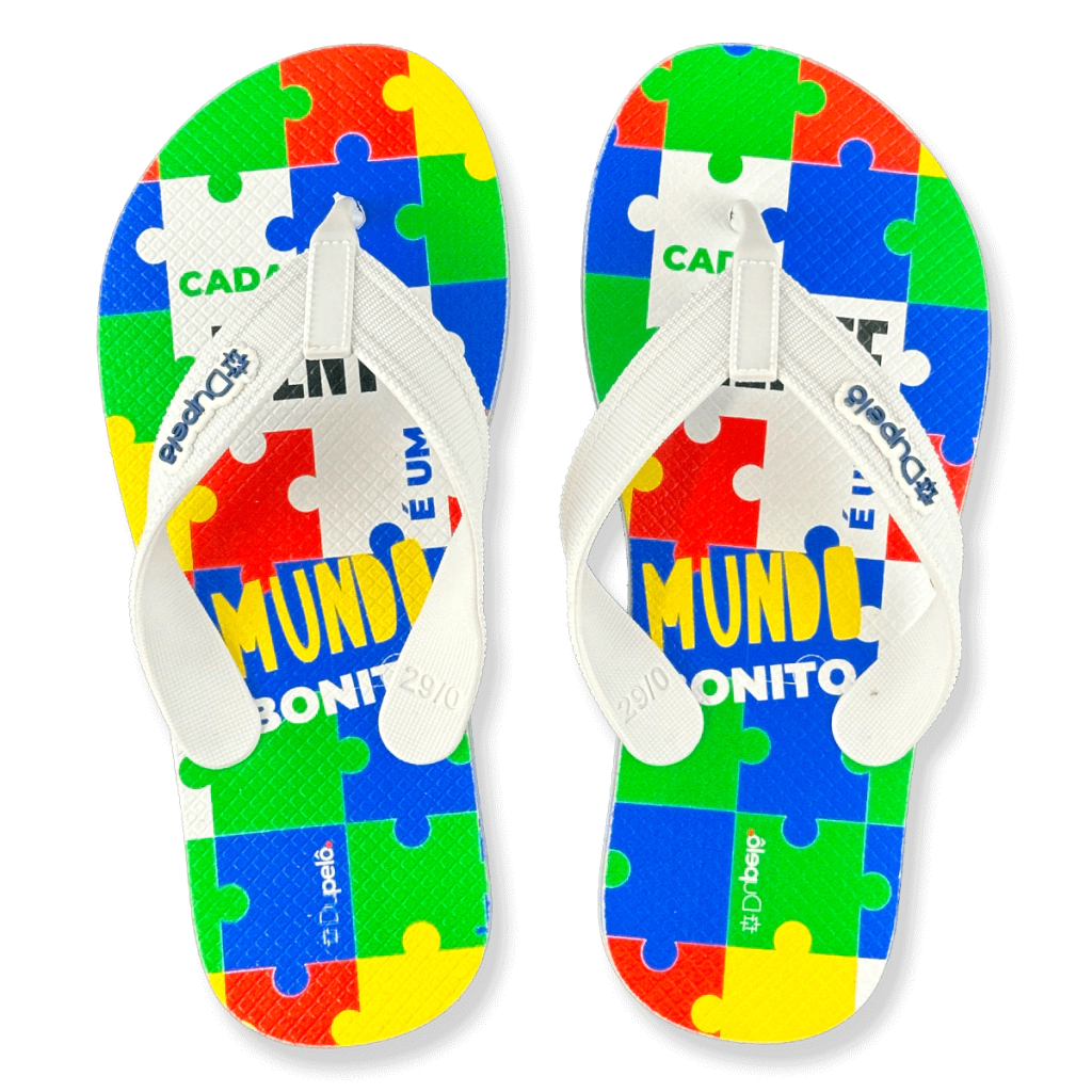 Inspirado nas peças de quebra-cabeça, símbolo mundial do autismo, o chinelo apresenta um mosaico vibrante de cores — azul, vermelho, verde, amarelo e branco — que juntos formam a frase “Cada mente é um mundo bonito”. As tiras brancas com aplicação do logo Dupelô trazem equilíbrio e destaque à estampa.