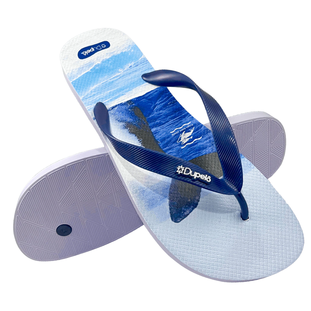 Com estampa realista da cauda da baleia em mergulho, o chinelo traz tons de azul profundo que remetem ao oceano. A tira azul marinho com aplicação premium do logo Dupelô reforça a sofisticação e identidade da marca.