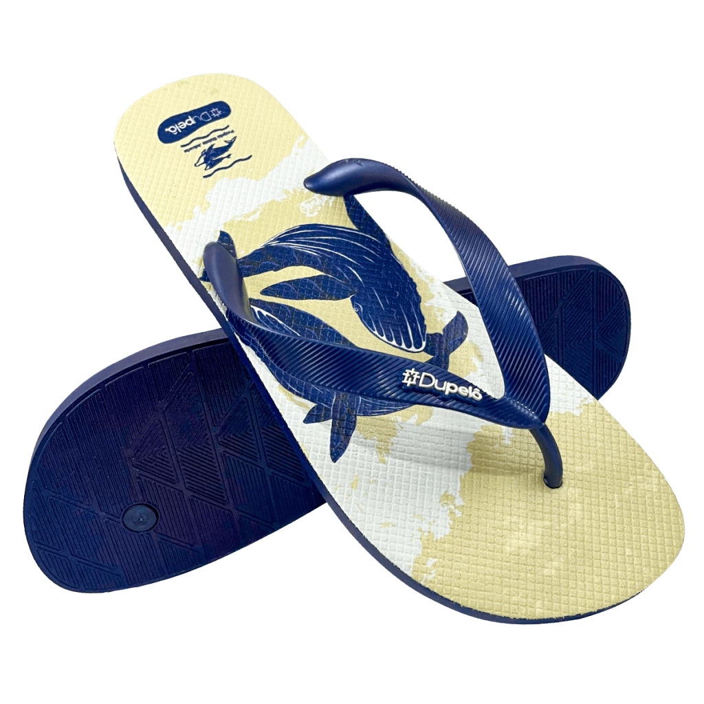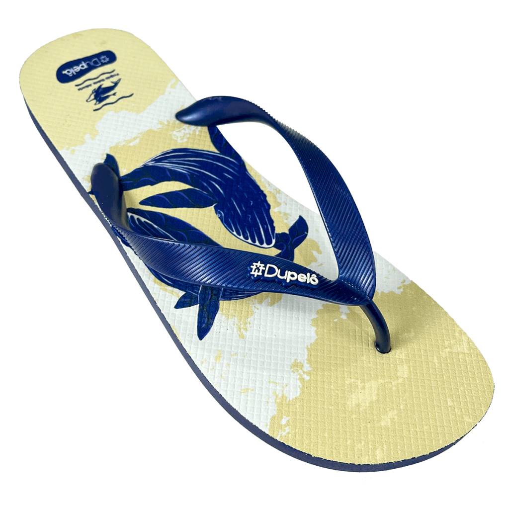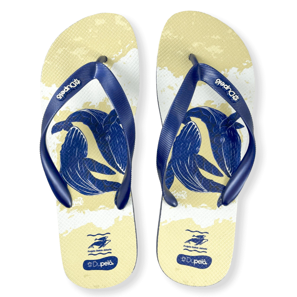 O modelo Dança das Baleias traz a imponência e a delicadeza dos gigantes dos oceanos em um design artístico inspirado na natureza. Mais que estilo, este chinelo carrega propósito: parte da receita é revertida para o Projeto Baleia Jubarte, que atua na conservação dos oceanos e na proteção da vida marinha.