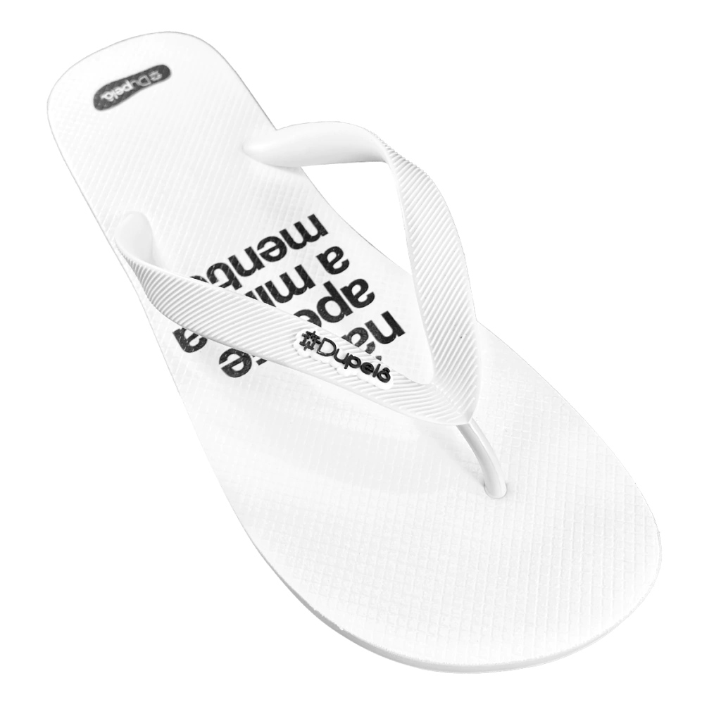 Com base branca clássica e tipografia preta imponente, este chinelo transmite simplicidade e ousadia ao mesmo tempo. A alça branca com logo Dupelô em preto completa o visual clean e moderno.